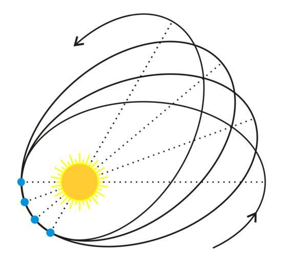 Keywords: Perihelion precession.svg en Perihelion precession Blue circle - mooving perihelion dotted line - semi-major axis pl Precesja peryhelium own Mpfiz 150px Apsidal precession