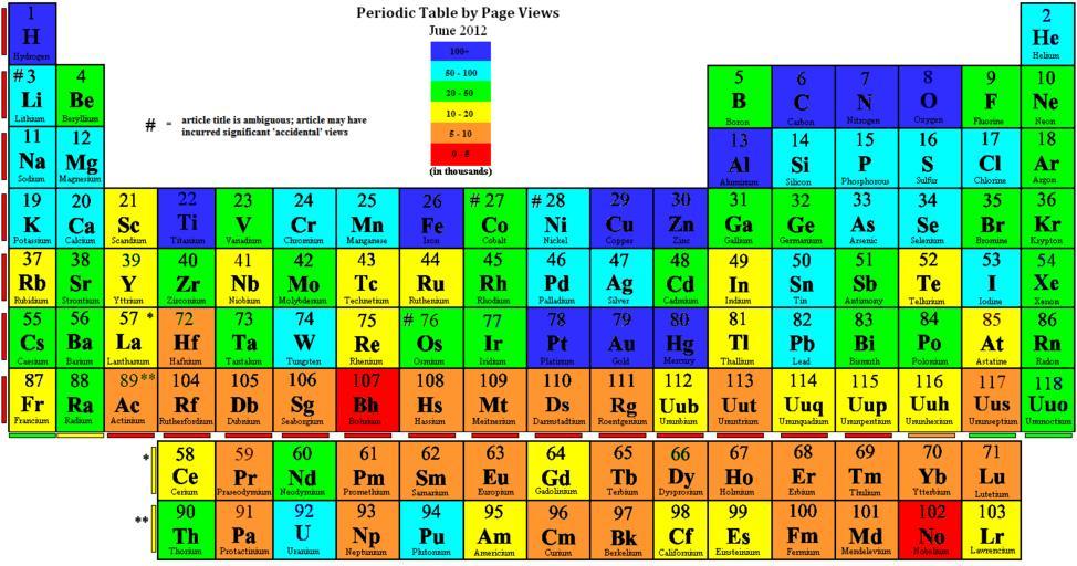 Keywords: Periodic table by page views.PNG Period Table of the Elements created by User Cryptic C62 color-coded to show the number of page views for in June 2008 the Wikipedia article for each element own original text I created this work entirely by myself 1 2008-08-23 Cryptic C62 · Talk Cryptic C62 Original upload log en wikipedia Periodic+table+by+page+views PNG 2012-09-16 06 29 Double sharp 1345×707× 128109 bytes <nowiki>update for August 2012</nowiki> 2012-08-19 08 57 Double sharp 1345×707× 127955 bytes <nowiki>update for July 2012</nowiki> 2012-07-14 16 28 Double sharp 1345×707× 127786 bytes <nowiki>updated for June 2012 the first time in 2 years the receding dark blue area looks scary</nowiki> 2010-08-25 18 29 Stone 1345×707× 115188 bytes <nowiki></nowiki> 2010-01-13 23 18 Cryptic C62 1345×707× 115536 bytes <nowiki>update for final edition</nowiki> 2009-11-18 20 30 Cryptic C62 1345×707× 117289 bytes <nowiki>update for October edition</nowiki> 2009-09-28 20 10 Cryptic C62 1345×707× 117490 bytes <nowiki>update for August edition</nowiki> 2009-05-15 03 33 Cryptic C62 1345×707× 117427 bytes <nowiki>update for April/May</nowiki> 2009-03-11 01 49 Cryptic C62 1345×707× 118149 bytes <nowiki>adding groups periods actinoids lanthanoids</nowiki> 2009-03-04 22 01 Cryptic C62 1343×707× 119190 bytes <nowiki>update for march 2009</nowiki> 2009-01-07 00 02 Cryptic C62 1343×707× 119901 bytes <nowiki>update for December edition</nowiki> 2008-11-06 01 57 Cryptic C62 1343×707× 121405 bytes <nowiki>update for october edition</nowiki> 2008-09-13 20 37 Cryptic C62 1343×707× 119691 bytes <nowiki>update for second edition</nowiki> 2008-09-02 19 25 Cryptic C62 1343×707× 119682 bytes <nowiki>redistributed s</nowiki> 2008-08-23 17 20 Cryptic C62 1343×707× 118600 bytes <nowiki> Period Table of the Elements created by User Cryptic C62 color-coded to show the number of page views for in June 2008 the Wikipedia article for each element I created this work entirely by myself 2008-08-23 A</nowiki> Periodic table |