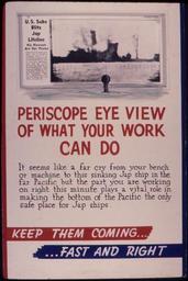 Keywords: Periscope eye view of what your work can do. Keep them coming... fast and right^ - NARA - 534780.jpg Scope and content General notes 534780 Local identifier 179-WP-929 Office for Emergency Management War Production Board 01/1942 - 11/03/1945 Still Picture Records Section Special Media Archives Services Division NWCS-S National Archives at College Park 8601 Adelphi Road College Park MD 20740-6001 other date circa 1942 1943 Record group Record Group 179 Records of the War Production Board 1918 - 1947 Record group ARC 508 War Production Board compiled 1942 - 1943 Series ARC 533858 File unit File unit ARC Variant control numbers NAIL Control Number NWDNS-179-WP-929 Other versions <gallery> File Periscope_eye_view_of_what_your_work_can_do _Keep_them_coming _fast_and_right _-_NARA_-_534780 tif tif File Periscope_eye_view_of_what_your_work_can_do _Keep_them_coming _fast_and_right _-_NARA_-_534780 jpg jpg </gallery> NARA-cooperation PD-USGov World War II posters from the United States |