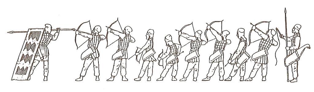 | Keywords: Persian army formation.png  en Persian army formation First row infantryman with big shield and spear Archers Last commanders and overseers Formation was good for defence but poor for attack fa آرایش پدافند در سپاهیان ایران باستان صف نخست پیاده نظام با سپر و نیزه صفوف بعد کمانداران صف پسین فرمانده یا سرپرست ru О игинальное описание Боевое пост оение пе сов Пе вый  яд составляли воины в защитном воо ужении с большими плетёными щитами и копьями они должны были п ик ывать остальные  яды лучников Пост оение замыкали команди ы и надсмот щики кото ые уде живали воинов от бегства Такое пост оение было хо ошо в обо оне до соп икосновения с п отивником но не могло наступать Scanned from book Всеми ная исто ия в четы ёх томах Д евний ми Сочинение п офессо а Оска а Еге а  1910 Издательство «Специальная лите ату а» Санкт-Пете бу г 1997 isbn 5-87685-085-3 т 1 ти аж 10000 824 ст Reprint of 1904 year edition by А Ф  а кс  1904 scan by ru user Кучумов Анд ей first publication before 1904 PD-old Achaemenids warriors Infantry formations Drawings of soldiers Bowmen Archers in art |