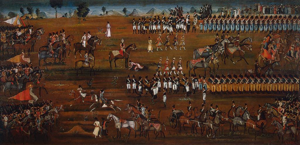 | Keywords: Persian Military Review with Fath Ali Shah and Abbas Mirza.jpg Commonist Persian 19th Century Soldiers Oil on canvas 203x415 cm Iran Qajar Dynasty Circa 1815/1816 A multifigure composition spreads across this huge canvas depicting a real event which took place in the Ujan valley in July 1813 the heir to the Iranian throne Abbas Mirza showing his father Fath Ali Shah the regular army newly reorganized along European lines by English and French instructors In the upper half of the painting left of centre is a rider in red Fath Ali Shah himself and at his horse's feet a figure in pink prostrating up on the ground - Abbas Mirza The ruler of Azerbaijan the most important and the richest province in Iran Crown Prince Abbas Mirza makes the lowest possible bow of the kind made even to the ruling shah only on special occasions The Shah and his numerous suite are preparing to pass between the ranks of soldiers wearing uniforms of European type By the right edge of the painting are musicians on camels and to the left - riders leading horses in rich trappings Further left are eight noble youths wearing head-dresses with feathers arranged in two rows these are the fast runners who always accompanied the ruler when he left the palace to clear the way before him At the very top right are the Ulema theologians and tutors in law in turbans and long robes with a group of people performing a ritual sacrifice of rams The painting formed part of the decoration of the Ujan castle of Abbas Mirza from where in 1828 it was removed by the Russians as a war trophy and brought to the Winter Palace in St Petersburg http //warfare uphero com/Persia/19thC/Persian_19th_Century_Soldiers htm circa 1815 -16 author PD-Art Battles in art Military history of the Qajar dynasty Abbas Mirza Qajar Military use of camels Animal sacrifice in Iran |