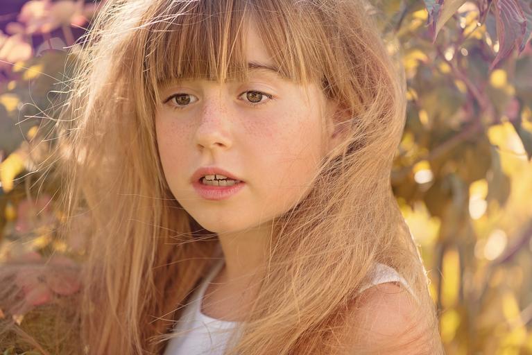 Keywords: person human child girl long hair face view portrait out nature summer summer wind close