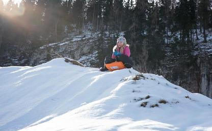 Keywords: person human child girl bob ride on slip downhill snow winter sunlight fun joy winter fun in motion