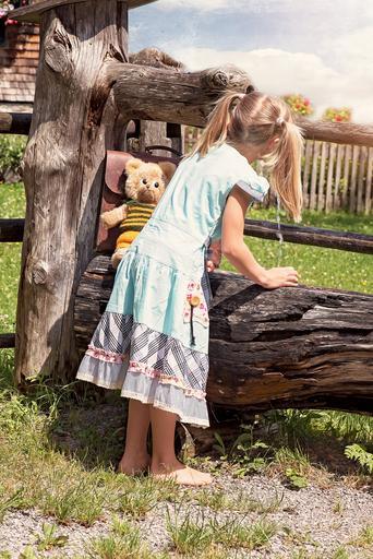 Keywords: person human child girl dress braids blond fountain teddy teddy bear drinking water nature wood fountain country life vintage