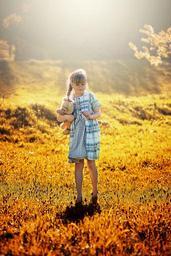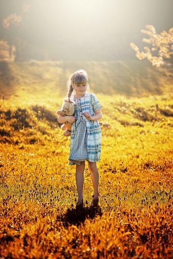 Keywords: person human child girl teddy bear out nature late summer dress portrait lighting