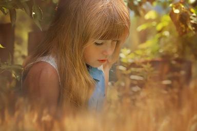 Keywords: person human female girl red head long hair face view dreamy garden nature out portrait close