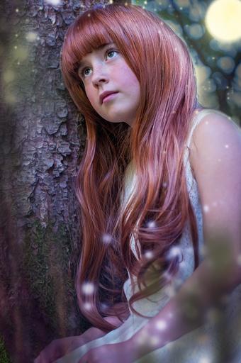 Keywords: person human female girl face long hair red hair thoughtful dreamy out forest fantasy portrait close