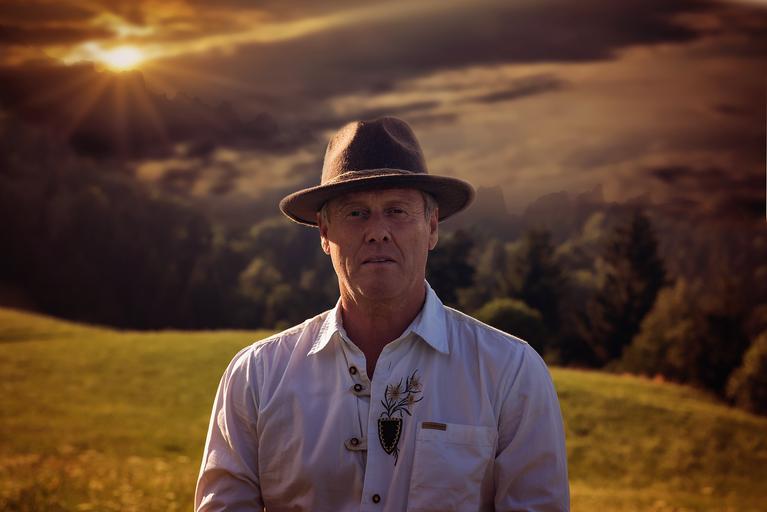 Keywords: person human male man hat costume nature out sunset lighting evening country life austria