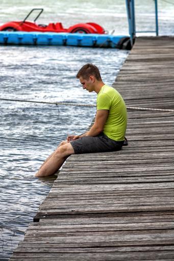 Keywords: person male young outdoors solitude loneliness relax lake pier dreaming summer