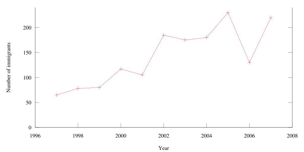 | Keywords: Peru-immigration-stats.svg en Graph of Peruvians immigrants granted UK citizenship by year 1997-2007 Source http //www fade nhs uk/cash/index php/2008/07/11/home-office-statistical-data/ NHS immigration statistics Own Olaf Davis 2009-04-30 Immigration in the United Kingdom Charts of Peru Sociological diagrams Line charts |