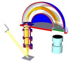 | Keywords: PES1.jpg en path of electrons in an Angle Resolved Photo Electron Spectroscopy ARPES experiment Own Saiht 2009-06-15 script in POVray <pre> // Schnitt durch ein PhotoelectronSpetroskopie Experiment // by Matthias Kreier version 0 8; global_settings assumed_gamma 1 0 default finish ambient 0 1 diffuse 0 9 include colors inc camera ultra_wide_angle angle 30 location <30 30 -45> look_at <6 12 0> //plane <0 1 0> -1 pigment color Red //plane <0 0 -1> -50 pigment color White plane <0 5 1 -1> -20 pigment color LightGray // Linsensystem zur Fokussierung und Retardierung declare Linsensystem union difference union box <-2 1 3 0 -2 1> <2 1 3 2 2 1> box <-2 1 3 4 -2 1> <2 1 3 6 2 1> box <-2 1 3 8 -2 1> <2 1 4 0 2 1> box <-2 1 6 8 -2 1> <2 1 7 0 2 1> pigment color Blue cylinder < 0 2 9 0 > <0 7 1 0> 0 81 pigment color Silver cylinder < 0 2 9 0 > <0 7 1 0> 2 pigment color Silver inverse difference union cylinder < 0 4 2 0 > <0 4 4 0> 2 1 cylinder < 0 4 3 0 > <0 6 5 0> 1 4 cylinder < 0 6 4 0 > <0 6 6 0> 2 1 cylinder < 0 7 2 0 > <0 7 4 0> 2 1 cylinder < 0 7 3 0 > <0 9 9 0> 1 4 cylinder < 0 9 8 0 > <0 10 0> 2 1 cylinder < 0 10 2 0 > <0 10 4 0> 2 1 cylinder < 0 10 3 0 > <0 11 2 0> 1 4 cylinder < 0 4 1 0 > <0 11 0> 1 2 pigment color Silver cylinder < 0 10 9 0 > <0 11 3 0> 0 8 pigment color Silver cylinder < 0 4 1 0 > <0 11 3 0> 2 pigment color Silver inverse translate <0 1 0> declare Kugelanalysator union intersection // innere Kugel difference sphere <6 14 0> 4 2 pigment color Silver sphere <6 14 0> 4 pigment color Blue box <1 14 0> <11 19 5> pigment color Red intersection // äußere Kugel difference sphere <6 14 0> 8 pigment color Blue sphere <6 14 0> 7 8 pigment color Silver box <-3 14 0> <15 23 9> pigment color Red difference // Herzog-Platte cylinder < 6 12 5 0 > < 6 13 0 > 9 pigment color LightSteelBlue cylinder < 0 12 4 0> <0 13 1 0> 1 1 pigment color Silver cylinder < 12 12 4 0> <12 13 1 0> 2 3 difference cylinder < 12 12 5 0 > < 12 13 8 0 > 2 4 pigment color Blue cylinder < 12 12 4 0> < 12 13 9 0> 2 2 pigment color Silver intersection // Eingangsspalte union box <-2 13 25 -2> <2 13 35 2> pigment color Blue box <-0 6 13 3 -2> <0 6 13 75 2> pigment color Blue box <-0 2 13 2 -2 1> <0 2 14 1 2 1> pigment color Silver inverse intersection // Eingangsblenden union cylinder < 0 13 85 0 > < 0 13 9 0 > 2 pigment color Blue cylinder < 0 13 1 0 > < 0 13 15 0 > 2 pigment color Blue box <-0 15 13 0 -1> <0 15 14 1 1> pigment color Silver inverse declare Scienta union object Linsensystem pigment color Blue object Kugelanalysator rotate<0 0 0> intersection // Linsensystem und Analysator entlang x aufgeschnitten object Scienta box <-3 2 0> <15 23 9> pigment color Red rotate<0 0 0> intersection union cylinder <12 13 3 0> <12 13 8 0> 2 pigment color CadetBlue // Channelplate cylinder <12 13 0 0> <12 13 2 0> 2 pigment color Green // Phosphorplatte box <9 10 0> <15 15 9> pigment color rgbf <1 1 1 1> difference cylinder <12 9 5 0> <12 11 0> 1 8 pigment color CadetBlue cylinder <12 10 0> <12 11 1 0> 1 6 pigment color Black cylinder <12 9 6 0> <12 8 0> 1 4 pigment color CadetBlue cylinder <12 8 1 0> <12 5 5 0> 1 8 pigment color CadetBlue // Weg der Elektronen declare Elektron1 union intersection intersection torus 6 0 5 rotate<-3 8 0 0> translate <0 0 46 0> torus 6 0 5 rotate< 3 8 0 0> translate <0 -0 46 0> torus 6 0 7 translate <-0 67 0 0> torus 6 0 7 translate < 0 67 0 0> rotate<90 0 0> translate<6 14 0> box <-2 14 -2> <13 23 2> cone < 0 11 0 > 0 2 <0 14 1 0> 0 05 cylinder < 0 5 0 > <0 11 0> 0 2 cone < 0 0 0 > 0 <0 5 0> 0 2 declare Elektron2 union intersection intersection torus 6 0 5 rotate<-3 8 0 0> translate <0 0 46 0> torus 6 0 5 rotate< 3 8 0 0> translate <0 -0 46 0> torus 6 0 7 translate <-0 67 0 0> torus 6 0 7 translate < 0 67 0 0> rotate<90 8 0> translate<6 14 0> box <-2 14 -2> <13 23 2> cone < 0 11 0 9 > 0 2 <0 14 1 0 9> 0 05 cylinder < 0 5 95 0 9 > <0 11 0 9> 0 2 cone < 0 0 0 > 0 <0 6 0 9> 0 2 declare Elektron3 union intersection intersection torus 6 0 5 rotate<-3 8 0 0> translate <0 0 46 0> torus 6 0 5 rotate< 3 8 0 0> translate <0 -0 46 0> torus 6 0 7 translate <-0 67 0 0> torus 6 0 7 translate < 0 67 0 0> rotate<90 -10 0> translate<6 14 0> box <-2 14 -2> <13 23 2> cone < 0 11 -0 9 > 0 2 <0 14 1 -0 9> 0 05 cylinder < 0 4 95 -0 9 > <0 11 -0 9> 0 2 cone < 0 0 0 > 0 <0 5 -0 9> 0 2 object Elektron1 pigment color rgbf <1 0 8 0 0 8> object Elektron2 pigment color rgbf <1 0 6 0 0 8> object Elektron3 pigment color rgbf <1 1 0 0 8> box <-1 8 -0 2 -1 8> <1 8 0 1 8> pigment color LightSteelBlue // Sample // einfallender Lichtstrahl He- oder Syncrotron cylinder <-12 12 0> <1 -1 0> 0 5 texture pigment rgbf<1 1 0 6 0 7> difference cylinder <-9 5 9 5 0> <-15 15 0> 1 cylinder <-9 4 9 4 0> <-13 13 0> 0 5 pigment color LightBlue light_source <12 18 -200> color White light_source // <0 26 -20> <30 30 -45> color White light_source // Rückseite beleuchten <20 30 10> color White / light_source // Kugel innen Licht <9 21 1 5> color White / </pre> Created with Persistence of Vision Photoemission spectroscopy |