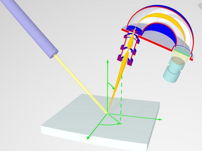 | Keywords: PES3.jpg en principle of Angle Resolved Photo Electron Spectroscopy Own Saiht 2009-06-15 Script in POVray <pre> // Schnitt durch ein PhotoelectronSpetroskopie Experiment // by Matthias Kreier version 0 8; global_settings assumed_gamma 1 0 default finish ambient 0 6 diffuse 0 4 include colors inc include textures inc camera ultra_wide_angle angle 48 location <20 30 -65> look_at <-2 12 0> //plane <0 1 0> -1 pigment color Red //plane <0 0 -1> -50 pigment color White plane <0 1 -1> -2000 pigment color LightGray // Linsensystem zur Fokussierung und Retardierung declare Linsensystem union difference union box <-2 1 3 0 -2 1> <2 1 3 2 2 1> box <-2 1 3 4 -2 1> <2 1 3 6 2 1> box <-2 1 3 8 -2 1> <2 1 4 0 2 1> box <-2 1 6 8 -2 1> <2 1 7 0 2 1> pigment color Blue cylinder < 0 2 9 0 > <0 7 1 0> 0 81 pigment color Silver cylinder < 0 2 9 0 > <0 7 1 0> 2 pigment color Silver inverse difference union cylinder < 0 4 2 0 > <0 4 4 0> 2 1 cylinder < 0 4 3 0 > <0 6 5 0> 1 4 cylinder < 0 6 4 0 > <0 6 6 0> 2 1 cylinder < 0 7 2 0 > <0 7 4 0> 2 1 cylinder < 0 7 3 0 > <0 9 9 0> 1 4 cylinder < 0 9 8 0 > <0 10 0> 2 1 cylinder < 0 10 2 0 > <0 10 4 0> 2 1 cylinder < 0 10 3 0 > <0 11 2 0> 1 4 cylinder < 0 4 1 0 > <0 11 0> 1 2 pigment color Silver cylinder < 0 10 9 0 > <0 11 3 0> 0 8 pigment color Silver cylinder < 0 4 1 0 > <0 11 3 0> 2 pigment color Silver inverse translate <0 1 0> declare Kugelanalysator union intersection // innere Kugel difference sphere <6 14 0> 4 2 texture Polished_Chrome sphere <6 14 0> 4 pigment color Blue box <1 14 -1> <11 19 5> pigment color Red intersection // äußere Kugel difference sphere <6 14 0> 8 pigment color Blue sphere <6 14 0> 7 8 pigment color Silver box <-3 14 -1> <15 23 9> pigment color Red difference // Herzog-Platte cylinder < 6 12 5 0 > < 6 13 0 > 9 pigment color LightSteelBlue cylinder < 0 12 4 0> <0 13 1 0> 1 1 pigment color Silver cylinder < 12 12 4 0> <12 13 1 0> 2 3 difference cylinder < 12 12 5 0 > < 12 13 8 0 > 2 4 pigment color Blue cylinder < 12 12 4 0> < 12 13 9 0> 2 2 pigment color Silver intersection // Eingangsspalte union box <-2 13 25 -2> <2 13 35 2> pigment color Blue box <-0 6 13 3 -2> <0 6 13 75 2> pigment color Blue box <-0 2 13 2 -2 1> <0 2 14 1 2 1> pigment color Silver inverse intersection // Eingangsblenden union cylinder < 0 13 85 0 > < 0 13 9 0 > 2 pigment color Blue cylinder < 0 13 1 0 > < 0 13 15 0 > 2 pigment color Blue box <-0 15 13 0 -1> <0 15 14 1 1> pigment color Silver inverse declare Optik union object Linsensystem pigment color Blue object Kugelanalysator rotate<0 0 0> declare Scienta union intersection // Linsensystem und Analysator entlang x aufgeschnitten object Optik box <-3 2 0> <15 23 9> pigment color Red intersection //aufgeschnitten union cylinder <12 13 3 0> <12 13 8 0> 2 pigment color CadetBlue // Channelplate cylinder <12 13 0 0> <12 13 2 0> 2 pigment color Green // Phosphorplatte box <9 10 0> <15 15 9> pigment color rgbf <1 1 1 1> difference // CCD Kamera cylinder <12 9 5 0> <12 11 0> 1 8 pigment color CadetBlue cylinder <12 10 0> <12 11 1 0> 1 6 pigment color Black cylinder <12 9 6 0> <12 8 0> 1 4 pigment color CadetBlue cylinder <12 8 1 0> <12 5 5 0> 1 8 pigment color CadetBlue cone <12 11 0> 1 6 <12 13 0> 2 texture pigment rgbf<1 1 0 8 0 7> // Weg der Elektronen declare Elektron1 union cone < 0 0 0 > 0 <0 21 5 0> 0 6 cone < 0 21 5 0 > 0 6 <0 23 0> 0 4 cone < 0 23 0 > 0 4 <0 24 2 0> 0 03 cone < 0 24 0 > 0 03 <0 25 0> 0 5 cone < 0 25 0 > 0 5 <0 26 0> 0 6 cone < 0 26 0 > 0 6 <0 27 0> 0 5 cone < 0 27 0 > 0 5 <0 29 5> 0 05 cone < 0 29 5 0> 0 05 <0 30 0> 0 1 intersection intersection torus 6 0 5 rotate<-3 8 0 0> translate <0 0 46 0> torus 6 0 5 rotate< 3 8 0 0> translate <0 -0 46 0> torus 6 0 7 translate <-0 67 0 0> torus 6 0 7 translate < 0 67 0 0> rotate<90 0 0> translate<6 30 0> // torus 6 0 1 rotate < 90 0 0 > translate<6 30 0> box <-2 30 -2> <13 39 2> declare Elektron2 union intersection intersection torus 6 0 5 rotate<-3 8 0 0> translate <0 0 46 0> torus 6 0 5 rotate< 3 8 0 0> translate <0 -0 46 0> torus 6 0 7 translate <-0 67 0 0> torus 6 0 7 translate < 0 67 0 0> rotate<90 8 0> translate<6 14 0> box <-2 14 -2> <13 23 2> cone < 0 11 0 9 > 0 2 <0 14 1 0 9> 0 05 cylinder < 0 5 95 0 9 > <0 11 0 9> 0 2 cone < 0 0 0 > 0 <0 6 0 9> 0 2 declare Elektron3 union intersection intersection torus 6 0 5 rotate<-3 8 0 0> translate <0 0 46 0> torus 6 0 5 rotate< 3 8 0 0> translate <0 -0 46 0> torus 6 0 7 translate <-0 67 0 0> torus 6 0 7 translate < 0 67 0 0> rotate<90 -10 0> translate<6 14 0> box <-2 14 -2> <13 23 2> cone < 0 11 -0 9 > 0 2 <0 14 1 -0 9> 0 05 cylinder < 0 4 95 -0 9 > <0 11 -0 9> 0 2 cone < 0 0 0 > 0 <0 5 -0 9> 0 2 declare Lichtquelle union cylinder <-18 18 0> <1 -1 0> 0 5 texture pigment rgbf<1 1 0 6 0 7> difference cylinder <-17 5 17 5 0> <-40 40 0> 1 8 cylinder <-17 4 17 4 0> <-20 20 0> 0 5 pigment color RichBlue declare Sample union box <-14 8 -2 5 -14 8> <14 8 0 14 8> pigment color LightBlue union // Koordinatensystem cylinder < 0 0 0 > < 16 1 0 0 > 0 1 cylinder < 0 0 0 > < 0 16 1 0 > 0 1 cylinder < 0 0 0 > < 0 0 -16 1> 0 1 cone < 16 0 0 > 0 3 < 17 0 0 > 0 cone < 0 16 0 > 0 3 < 0 17 0 > 0 cone < 0 0 -16> 0 3 < 0 0 -17> 0 intersection torus 8 0 1 box < 0 -0 1 -8 1 > < 5 66 0 1 -5 66> cylinder < 0 0 0 > < 6 0 -6 > 0 1 intersection torus 10 0 1 box < 0 -0 1 -10 1 > < 4 8 0 1 -4 8> rotate <90 45 0> cone < 5 66 0 -5 66 > 0 < 5 0 -6 3 > 0 3 cone < 3 38 8 8 -3 38> 0 < 2 5 9 3 -2 5> 0 3 pigment color Green cylinder < 5 66 15 -5 66> < 5 66 0 -5 66 > 0 1 pigment checker color Green color rgbf <1 1 1 1> // alles zusammenbauen object Scienta translate < 0 16 0 > rotate < -20 0 -20 > object Elektron1 pigment color Orange rotate < -20 0 -20 > //object Elektron2 pigment color rgbf <1 0 6 0 0 8> //object Elektron3 pigment color rgbf <1 1 0 0 8> object Lichtquelle object Sample // Lichtquellen light_source <-60 28 -200> color White light_source // <0 26 -20> // <30 30 -45> <20 30 -65> color White / light_source // Rückseit