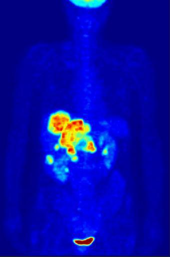Keywords: PET-MIPS anim frame.PNG en Maximum Intensity Projection MIP of a wholebody positron emission tomography PET acquisition of a 79 kg weighting female after intravenous injection of 371 MBq of <sup>18</sup>F-FDG one hour prior measurement The investigation has been performed as part of a tumor diagnosis prior to applying a radiotherapy tumor staging step Besides normal accumulation of the tracer in the heart bladder kidneys and brain liver metastases of a colorectal tumor are clearly visible within the abdominal region of the image de Maximumintensitätsprojektion MIP einer Ganzkörperaufnahme mittels Positronen-Emissions-Tomographie PET Die Aufnahme zeigt eine 79 kg schwere weibliche Patientin nach intravenöser Injektion von 371 MBq <sup>18</sup>F-FDG eine Stunde vor Messung Die Untersuchung wurde im Rahmen einer Tumordiagnose vor Anwendung einer Strahlentherapie sogn Tumorstaging durchgeführt Neben den normalen Anreicherungen des Tracers in Herz Blase Nieren und Gehirn sind auch Lebermetastasen eines kolorektalen Tumor im abdominalen Bereich der Aufnahme auszumachen fr Projection d'intensité maximale MIP d'un corps entier par topographie à émission de positons TEP d'une femme de 79 kg après une injection intraveineuse de 371 MBq de <sup>18</sup>F-FDG une heure avant la mesure L'étude a été réalisée lors d'un diagnostic de tumeur avant d'appliquer une radiothérapie étape tumeur Outre l'accumulation normale du traceur dans le cœur la vessie des reins et du cerveau des métastases hépatiques d'une tumeur colorectale sont clairement visibles dans la région abdominale de l'image PET-MIPS-anim gif 2006-05-22 Jens Langner http //www jens-langner de/ Damato Positron emission tomography |
