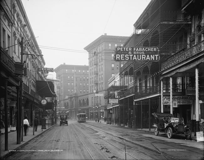| Keywords: Peter Fabacher Bros Restaurant New Orleans.jpg LargeImage St Charles Street from Canal New Orleans LA Photo looking upriver on the 100 and 200 blocks of St Charles Avenue New Orleans Central Business District circa 1910 Various commercial buildings are seen on both sides of street of the closer block including shops a pharmacy hotels and restaurants Visible signs include Peter Fabacher Bros Restaurant Furnished Rooms Fox the Hatter Kolb Traverse Diamond Setting Up Stairs Spencer Business College Day and Night C J Michel Co Pressing Curio Store Strafford Hats ; multiple signs for Cumberland Telephone Telegraph Company Local and Long Distance Telephone Pay Station At right an automobile parked by the curb has a sign reading For Hire by Hour or Trip At left a street clock shows the time as 8 00 At corner of Common Street a streetcar and an other automobile are seen In the next block is the St Charles Hotel Detroit Publishing Company photograph via Library of Congress website http //www loc gov/pictures/item/det1994021318/PP/ High res TIF contrast adjusted border cropped and converted to jpg before uploading to Wikimedia Commons 1910 Uncredited photographer for Detroit Publishing Company PD-US PD-Detroit Postcard made from this photo thumb Automobiles in New Orleans Balconies in New Orleans Street clocks in Louisiana Kolb's New Orleans St Charles Avenue New Orleans CBD St Charles Hotel New Orleans third building Shops in New Orleans Signs in New Orleans Streetcars in New Orleans Black and white photographs of trams New Orleans in the 1910s Hotels in the 1910s |