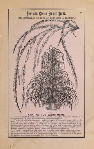 | Keywords: Peter Henderson and Co's seed catalogue (16256696489).jpg s are such as we have received from the introducers <br> AMARANTHUS SALICIFOLIUS <br> This remarkably beautiful annual was introduced from the Philippine Islands and <br> is undoubtedly the finest Amaranthus ever offered to the public <br> The leaves which are beautifully undulated vary in the earlier stages of growth <br> from a green to a bronzy green shade and are from five to seven inches in length by about <br> a quarter of an inch in width As the plants get stronger the leaves at the ends of all <br> the principal branches assume a bright orange red color and become more elongated <br> generally being from ten to fifteen inches in length forming magnificent bright-colored <br> plumes and giving the plant a most elegant and picturesque appearance <br> From its extremely graceful habit and rich colors this plant produces a striking <br> effect when planted in large beds or masses ; it also forms a very handsome object as a <br> single specimen for the centre of a vase or small bed ' and is invaluable as a pot plant <br> for Autumn green-house decoration Per Packet 50 cents 42671225 135980 68080 Page 81 Text http //www biodiversitylibrary org/page/42671225 1872 10 5962/bhl title 68080 Henry G Gilbert Nursery and Seed Trade Catalog Collection ; Peter Henderson Co NameFound Amaranthus NameConfirmed Amaranthus EOLID 37601 NameBankID 2646887 NameFound Amaranthus salicifolius NameConfirmed Amaranthus salicifolius Hort Veitch 1871 EOLID 5172108 Biodiversity Heritage Library Peter Henderson Co's seed catalogue 1872 Garden Stories Catalogs Flowers Gardening Peter Henderson Co Plants Ornamental Seeds U S Department of Agriculture National Agricultural Library bhl page 42671225 dc identifier http //biodiversitylibrary org/page/42671225 Amaranthus salicifolius bhlGardenStories BHLinbloom peter henderson co plants ornamental u s department of agriculture national agricultural library bhlgardenstories bhlinbloom Information field Flickr posted date ISOdate 2015-02-04 CC-BY-2 0 BioDivLibrary https //flickr com/photos/61021753 N02/16256696489 2015-08-24 05 51 00 cc-by-2 0 PD-old-70-1923 1872 books Peter Henderson Co's seed catalogue Photos uploaded from Flickr by Fæ using a script |