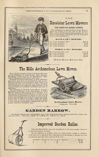 Keywords: Peter Henderson and Co's seed catalogue (16251132627).jpg PETER HENDERSON CO 'S CATALOGUE OF SEEDS <br> THE <br> l Izcelsior Lawn M©w©f i <br> FOE HAND OR HORSE POWER <br> We confidently recommend these Lawn Mowers <br> which we believe to be the best in the market <br> They contain all the latest improvements are per- <br> fect iti construction and finish and are warranted <br> to give entire satisfaction <br> HAND LAWN MOWERS <br> No I cuts 9 inches price 15 00 <br> No 2 cuts 12 inches 20 00 <br> No 3 cuts 15 inches 25 00 <br> No 4 cuts 18 inches 30 00 <br> HORSE LAWN MOWERS <br> No 5 cuts 25 inches price 75 00 <br> No 6 cuts 30 inches 125 00 <br> No 7 cuts 35 inches 165 00 <br> No 8 cuts 40 inches 200 00 <br> Horse Boots 12 per Set <br> The Hills Archimedean Lawn Mower <br> The principle features of this well-known Machine <br> are its simplicity of Construction Easy Draught <br> Durability Perfectness in its Manufacture Easy <br> way of Sharpening the Cutters when-dull <br> Upwards of Sixteen Thousand of these Machines <br> have been sold since its introduction and so per- <br> fect and correct are the principles upon which it is <br> constructed that not one has ever been returned <br> Yet experience has suggested improvements chief <br> among which are increased durability and ease of <br> operating <br> The invention of the Hills Lawn Mower wrought <br> a complete revolution in the manufacture of Lawn <br> Mowers both in this country and in Europe as it <br> was the first balanced Lawn Mower ever made being <br> constructed on principles so simple as not only to <br> reduce cost placing it in reach of every person need- <br> ing it but it is also of very light weight and draft <br> so that even a lad can work them with ease doing <br> a way with the cumbersome complicated and ex- <br> pensive machines heretofore used <br> Archimedean Lawn Mower <br> 14 inch cut Price 25 <br> r <br> Our Garden Barrows are substantially made with hard-wood frames strong hand-made wheels and <br> iron axle-boxes Price No 1 4 50; No 2 6 00; No 3 6 50; No 4 7 00 <br> siprojfi lailii Rollw <br> Since the Hand Roller was first introduced it has been greatly improved <br> in style and variety of forms <br> By the addition of weights along the shaft greater weight is obtained <br> while they are so adjusted that when not in use the handle is thrown up from <br> the ground and kept clean and out of the way <br> 2 Sections each 7 £ in long by 15 in diameter 12 00 <br> 2 12 20 25 00 <br> 2 12 24 30 00 43797088 148915 77745 Page 89 Text http //www biodiversitylibrary org/page/43797088 1875 10 5962/bhl title 77745 Henry G Gilbert Nursery and Seed Trade Catalog Collection ; Peter Henderson Co Biodiversity Heritage Library Peter Henderson Co's seed catalogue 1875 new album Garden Stories Catalogs Equipment and supplies Gardening Peter Henderson Co Seed industry and trade Seeds Trade catalogs U S Department of Agriculture National Agricultural Library bhl page 43797088 dc identifier http //biodiversitylibrary org/page/43797088 bhlGardenStories BHLinbloom peter henderson co u s department of agriculture national agricultural library bhlgardenstories bhlinbloom Information field Flickr posted date ISOdate 2015-02-03 CC-BY-2 0 BioDivLibrary https //flickr com/photos/61021753 N02/16251132627 2015-08-24 05 55 00 cc-by-2 0 PD-old-70-1923 1875 books Peter Henderson Co's seed catalogue Photos uploaded from Flickr by Fæ using a script |