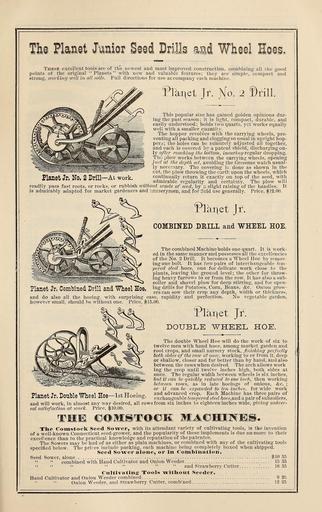 Keywords: Peter Henderson and Co's seed catalogue (16411067776).jpg The Fkait Janior Seed <br> Whit <br> These excellent tools are of the newest and most improved construction combining all the good <br> points of the original Planets with new and valuable features; they are simple compact and <br> strong working well in all soils Full directions for use accompany each machine <br> Planet Jf sfo Drill <br> This popular size has gained golden opinions dur- <br> ing the past season ; it is light compact durable and <br> easily understood; holds two quarts yet works equally <br> well with a smaller quantity <br> The hopper revolves with the carrying wheels pre- <br> venting all packing and clogging so usual in upright hop- <br> pers; the holes can be minutely adjusted all together <br> and each is covered by a patent shield discharging on- <br> ly after reaching the bottom insuring regular dropping <br> The plow works between the carrying wheels opening <br> just at the depth set avoiding the tiresome watch usual- <br> ly necessary The covering is done as shown in the <br> cut the plow throwing the earth upon the wheels which <br> continually return it exactly on top of the seed with <br> admirable regularity and certainty The plow will <br> readily pass fast roots or rocks or rubbish without waste of seed by a slight raising of the handles It <br> is admirably adapted for market gardeners and nurserymen and for Held use generally Price 12 00 <br> Planet Jr No 2 Drill ” At work <br> COMBINED DRILL and WHEEL HOE <br> The combined Machine holds one quart It is work- <br> ed in the same manner and possesses all the excellencies <br> of the No 2 Drill It becomes a Wheel Hoe by remov- <br> ing one bolt It has two pairs of interchangeable tem- <br> pered steel hoes one for delicate work close to the <br> plants leaving the ground level; the other for throw- <br> ing heavy furrows to or from the row It has also a sub- <br> soiler and shovel plow for deep stirring and for open- <br> ing drills for Potatoes Corn Beans c Onion grow- <br> ers can sow their crop any depth width or thickness <br> and do also all the hoeing with surprising ease rapidity and perfection No vegetable garden <br> however small should be without one Price 15 00 <br> Planet Jr Combined Drill and Wheel Hoe <br> 'Planet Jf <br> DOUBLE WHEEL HOE <br> The double Wheel Hoe will do the work of six to <br> twelve men with hand hoes among market garden and <br> root crops and small nursery stock finishing perfectly <br> both sides of the row at once working to or from it deep <br> or shallow closer and far better than by hand and also <br> between the rows when desired The arch allows work <br> ing the crop until twelve inches high both sides at <br> once The regular width between wheels is six inches <br> but it can be quickly reduced to one inch then working <br> between rows as in late hoeings of onions c ; <br> or it can be expanded to ten inches for wide work <br> and advanced crop Each Machine has three pairs of <br> exchangeable tempered steel hoes n a pair of subsoilers <br> y desired all rows from six inches to eighteen inches wide giving univer- <br> 10 00 <br> MAOHIZflSS <br> Planet Jr Double Wheel Hoe ” 1st Hoeing <br> and will work in almost any w; <br> sal satisfaction at work Price <br> THE <br> The Comstock Seed Sower with its attendant variety of cultivating tools is the invention <br> of a well-known Connecticut seed-grower and the popularity of these implements is due no more to their <br> excellence than to the practical knowledge and reputation of the patentee <br> The Sowers may be had of us either as plain machines or combined with any of the cultivating tools <br> specified below The prices include packing each machine being completely boxed when shipped <br> Seed Sower alone or in Combination <br> Seed Sower alone 10 35 <br> combined with Hand Cultivator and Onion Weeder 15 35 <br> and Strawberry Cutter ' 18 35 <br> Cultivating Tools without Seeder <br> Hand Cultivator and Onion Weeder combined 9 25- <br> Onion Weeder and Strawberry Cutter combined 12 25 43797084 148915 77745 Page 85 Text http //www biodiversitylibrary org/page/43797084 1875 10 5962/bhl title 77745 Henry G Gilbert Nursery and Seed Trade Catalog Collection ; Peter Henderson Co Biodiversity Heritage Library Peter Henderson Co's seed catalogue 1875 new album Garden Stories Catalogs Equipment and supplies Gardening Peter Henderson Co Seed industry and trade Seeds Trade catalogs U S Department of Agriculture National Agricultural Library bhl page 43797084 dc identifier http //biodiversitylibrary org/page/43797084 bhlGardenStories seed drill BHLinbloom peter henderson co u s department of agriculture national agricultural library bhlgardenstories bhlinbloom Information field Flickr posted date ISOdate 2015-02-03 CC-BY-2 0 BioDivLibrary https //flickr com/photos/61021753 N02/16411067776 2015-08-24 05 52 51 cc-by-2 0 PD-old-70-1923 1875 books Peter Henderson Co's seed catalogue Photos uploaded from Flickr by Fæ using a script |
