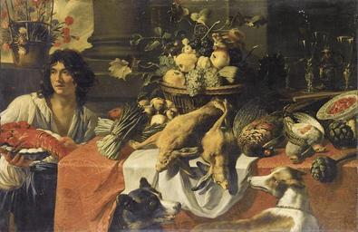 | Keywords: Peter van Boucle - Still life of fruit, vegetables and game on a table, with the figure of a boy laying lobster on a plate.jpg  Artwork Creator Peter van Boucle firsthalf other date century 17 oil canvas size cm 121 188 Private collection object history credit line Sold at Christie's on 28 May 2008 at Milan Palazzo Clerici accession number http //www christies com/lotfinder/paintings/pieter-van-boucle-natura-morta-di-frutta-5084910-details aspx PD-old-100 Peter van Boucle 17th-century still life paintings in private collections Oil still life paintings Paintings of grapes 17th-century still life paintings of fruit baskets 17th-century still life paintings of fruits Paintings with squirrels Still-life paintings of living animals Paintings of lobsters |