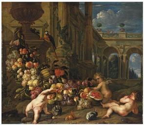 | Keywords: Peter Ykens and Jan Pauwel Gillemans - An architectural capriccio with putti around a swag of fruit, with a parrot, squirrel and rabbits.jpg  Artwork Creator Peter Ykens and Creator Jan Pauwel Gillemans II en An architectural capriccio with putti around a swag of fruit with a parrot squirrel and rabbits 1671 - 1695 http //www christies com/lotfinder/paintings/peter-ykens-and-jan-pauwel-gillemans-5221833-details aspxww lukasweb be/en/photo/bloemenkrans-als-omlijting-van-de-heilige-familie-0 Oil canvas size cm 61 69 8 object history credit line signed 'P YKENS' lower right Sold at Christie's 8 July 2009 London lot 173 accession number PD-old-100 PD-old-100 Peter Ykens Jan Pauwel Gillemans II 17th-century oil on canvas paintings |