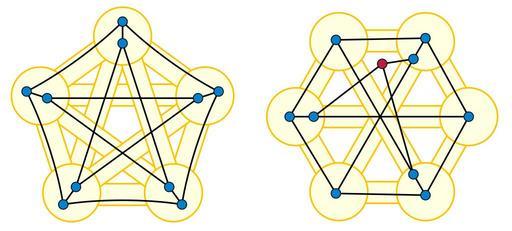 | Keywords: Petersen Wagner minors.svg graph minors of Wagner's theorem K<sub>5</sub> left and K<sub>3 3</sub> right in the nonplanar Petersen graph The Petersen graph is shown with the small colored disks as vertices and with solid black edges Its minors shown in pale yellow may be formed by deleting the red vertex and contracting the edges that lie within a single yellow circle 2013-02-06 14 28 42 own David Eppstein cc-zero Files by User David Eppstein from en wikipedia Petersen graph | ||||