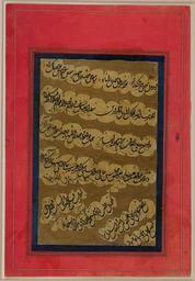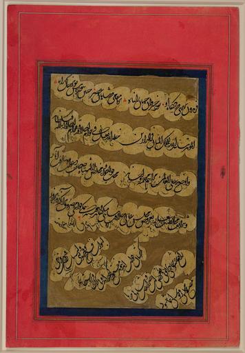 Keywords: Petition to a Ruler WDL6843.png Artwork ru П ошение п авителю fr Pétition à un souverain en Petition to a Ruler zh 向统治 提交的请愿书 pt Petição a um regente ar التماس إلى حاكم ru Ве оятно данный ф агмент был частью сбо ника лите ату ных сочинений <em> муншаат </em> в кото ом соде жались п авильные ва ианты написания хвалы и п ошений п авителю екото ые из этих п оизведений каллиг афии в том числе и п едставленное здесь ве оятно были выполнены письмом талик в Индии в XVII и XVIII веках В этом от ывке ассказывается как сочинить официальную хвалу <em> нат </em> или <em> мунаят </em> п авителю упот ебляя большое количество почтительных эпитетов <em> алкаб </em> Ряд хвалебных слов п о власть <em> мулкуху </em> п авителя и его господство <em> султанху </em> п едшествуют официальной п осьбе или п ошению <em> а дх </em> или <em> а з </em> а п едпоследней диагональной линии указана дата 14 Джумада I без указания года или подписи каллиг афа Данное сочинение выполнено че ными че нилами на бежевой бумаге индийским письмом талик и об амлено облакооб азными полосами Похоже что че нила с д угого каллиг афического ф агмента кото ый находился анее в том же сбо нике п осочились на эту аботу екото ые ст оки написанные на об атной сто оне листа оставили следы на цент альной каллиг афической панели Текст наклеенный на озовый лист с ка тонной подложкой написан на золотистом фоне и об амлен п остой синей каймой <br>А абская каллиг афия; А абские укописи; Иллюмини ование укописей; Ко оли и п авители fr Ce fragment a probablement fait partie d'une collection de <em>munshaats</em> compositions littéraires montrant comment écrire des louanges et des pétitions appropriées à un souverain Certaines de ces calligraphies y compris celle-ci semblent avoir été exécutées en écriture taliq en Inde durant les XVII<sup>e</sup> et XVIII<sup>e</sup> siècles Ce fragment indique comment composer une <em>na't</em> ou <em>munajat </em> louange formelle à un souverain en utilisant ses nombreux <em>alqabs</em> épithètes honorifiques Un certain nombre de louanges quant au <em>mulkuhu</em> pouvoir et à la <em>sultanuhu</em> autorité du souverain précèdent l'<em>ardh</em> ou <em>arz</em> demande ou pétition formelle Dans l'avant-dernière ligne diagonale la date du 14 jumadah I apparaît Cependant ni l'année ni la signature du calligraphe n'ont été inscrites La composition est exécutée en écriture taliq indienne noire encadrée de bandes de nuages sur un papier beige L'encre d'un autre fragment de calligraphie autrefois inclus dans le même album de calligraphies semble avoir déteint sur ce document Plusieurs lignes en écriture inversée ont taché le panneau de calligraphie central Le texte qui apparait sur un fond peint en encre or est encadré d'une bordure ordinaire bleue et collé sur une feuille rose renforcée par du carton au dos <br>Calligraphie arabe; Manuscrits arabes; Enluminures; Rois et dirigeants en This fragment probably formed part of a collection of <em>munsha'at</em> literary compositions showing how to write appropriate praises and petitions to a ruler Some of these calligraphies including this piece appear to have been executed in Ta'liq script in India during the 17th and 18th centuries This fragment tells how to compose a <em>na't</em> or <em>munajat </em> formal praise to a ruler using his many <em>alqab </em> honorific epithets A number of praises of the ruler's <em>mulkuhu</em> power and his <em>sultanuhu</em> dominion precede the <em>ardh</em> or <em>arz</em> formal request or petition In the penultimate diagonal line appears the date of 14 Jumadah I although no year is specified nor is the piece signed by its calligrapher The composition is executed in black Indian Ta'liq script framed by cloud bands on a beige paper The ink from another calligraphic fragment formerly contained in the same album of calligraphies seems to have bled onto this piece Several lines in reverse writing have stained the central calligraphic panel The text appears on a background painted in gold ink is framed by a plain blue border and is pasted to a pink sheet backed by cardboard <br>Arabic calligraphy; Arabic manuscripts; Illuminations; Kings and rulers zh 此残卷可能是 <em>munsha'at</em>( 文学 品集 )的 部分,展示了如何编写 当的赞美辞和请愿书提交给统治 其中 些书法 品,包括这个残卷,似乎是 17 世纪和 18 世纪的印度以塔利克字体书写的 此残卷说明了如何利用统治 的多种<em>尊号</em>为其撰写<em></em><em>正式的赞美辞</em> <em>ardh</em> 或 <em>arz</em>(正式的请求或请愿)之前, 大量对统治 <em> 力</em>及其<em>统治</em>的赞美 虽然此残卷 指明年份,也没 书法家的署名,但 数第二行对角文字上,出现了伊斯兰历 5 14 日的日 此 品是以黑色印度塔利克字体写 张米色的纸张上,文字以带状云彩图案为边框 之前包含 同 书法集的另 个
