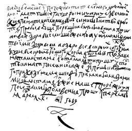 Keywords: Petr1 NataljaKirillovna.jpg Letter by Tsar Peter I to his mother Natalia Kirillovna in April 1689 Still the script style resembles very much the Greek uncial Письмо Пет а Великого к ца ице аталье Ки илловне Текст о фог афия исп авлена по сов еменным но мам Вселюбезнейшей и д ажайшей моей мате и Госуда ыне-Ца ице и Великой Княгине аталии Ки илловне Сынишка твой в аботе п ебывающий Пет ушка благословения п ошу и о твоем зд авии слышать желаю; а у нас молитвами твоими здо ово все А озе о все вск ылось сего 20-го числа и суда все к оме большого ко абля в деле только за канатами дело станет; и о том милости п ошу чтобы мне канаты до семисот сажень не мешкав п исланы были Посем паки благословения п ошу Ocherki iz istorii Petra Velikogo i ego vremeni 2nd edition 1914 reprint 1990 ISBN 5-7158-0005-6 Отскани ованное изоб ажение из книги С Князькова «Оче ки из исто ии Пет а Великого и его в емени» 1914 Ап ель 1689 Peter I of Russia Handwriting Cyrillic manuscripts Peter I of Russia's autographs Signatures of Russian monarchs Natalia Kirillovna Naryshkina PD-old