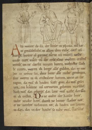 Keywords: Pfaffe Konrad - Rolandslied - cod. pal. germ. 112 - 012.jpg Pfaffe Konrad - Rolandslied - cod pal germ 112 - jpg 011 013 Kaiser Karl berät sich mit Roland l und Olivier r Rolandslied des Pfaffen Konrad à bersetzung bzw Bearbeitung der altfranzösischen Chanson de Roland um 1100 Blatt 5v Pfaffe Konrad Rolandslied Pergament 123 Blatt 21x15 cm Regensburg/Hessen-Thüringen Ende 12 Jahrhundert Cod pal germ 112 Universitätsbibliothek Heidelberg http //diglit ub uni-heidelberg de/diglit/cpg112 century 12 Pfaffe Konrad PD-old Rolandslied Cod Pal germ 112 Medieval miniatures of Carolus Magnus Roland |