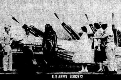 Keywords: blackandwhite monochrome black and white OPEN HOUSE —- Open house at the Village Green Nike site features as one of its displays this Ajax missile, mounted on a trailer, and protective suit. SFC John T. Woods (right) explains missile operation to his wife and LaJuana Mitchell, 17. Other missile personnel are Sgt. Kelly Starnes (left) and Sp/3 Jesse Mann. The open house is one of many at Delaware County military installations today as part of the Armed Forces Day celebration, which also includes a parade of more than 2,000 marchers in Chester at 3 p.m., and a patriotic ceremony at Pennsylvania Military College afterwards. OPEN HOUSE —- Open house at the Village Green Nike site features as one of its displays this Ajax missile, mounted on a trailer, and protective suit. SFC John T. Woods (right) explains missile operation to his wife and LaJuana Mitchell, 17. Other missile personnel are Sgt. Kelly Starnes (left) and Sp/3 Jesse Mann. The open house is one of many at Delaware County military installations today as part of the Armed Forces Day celebration, which also includes a parade of more than 2,000 marchers in Chester at 3 p.m., and a patriotic ceremony at Pennsylvania Military College afterwards. |