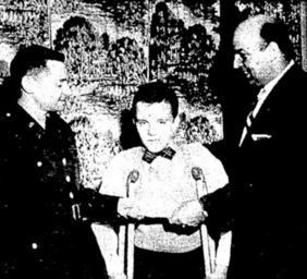Keywords: blackandwhite monochrome black and white ASSIST FROM NIKE SITE — Lieut. Glenn A. Cordell, commander of "C" Battery 176th AAA Missile Batt., turns over $204 to Vincent Smith, chairman of the March of Dimes campaign in Aston Township, which was contributed by the soldiers at the site. Looking on is Jamie Culver, 12, of 14 Pancoast av., Green Ridge, a polio victim. ASSIST FROM NIKE SITE — Lieut. Glenn A. Cordell, commander of "C" Battery 176th AAA Missile Batt., turns over $204 to Vincent Smith, chairman of the March of Dimes campaign in Aston Township, which was contributed by the soldiers at the site. Looking on is Jamie Culver, 12, of 14 Pancoast av., Green Ridge, a polio victim. |
