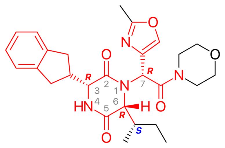 Keywords: Phamacophore of Retosiban.svg en Numbered 2D structure of the oxytocin antagonist retosiban showing the 2 5-diketopiperazine pharmacophore required for good activity 2016-02-22 own Alandb other versions cc-zero Retosiban