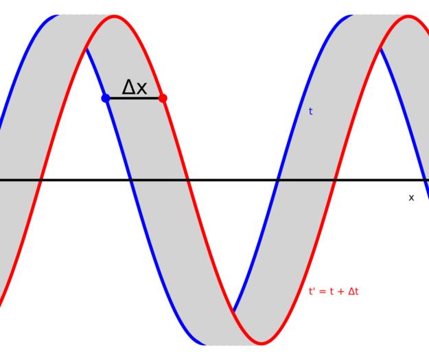Keywords: Phase velocity.svg A wave as a function of spatial coordinate x at two different times Own 2008-01-09 Pieter Kuiper PD Created with Text Editor Wave mechanics