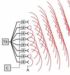 | Keywords: Phased array animation 10 frames 371x400px 100ms.gif phased array antenna works A phased array is a computer-controlled antenna which produces a beam of radio waves that can be steered electronically to point in different directions without turning the antenna They are widely used in military radar The phased array consists of an array of multiple identical antenna elements A driven by a transmitter TX The feed current for each antenna passes through a device called a phase shifter φ which is controlled by a computer control system C The moving red lines show the wavefronts surfaces of constant phase of the radio waves emitted by each antenna The waves of the individual antennas are spherical but they combine superpose in front of the antenna to make a plane wave a beam of radio waves traveling in a specific direction By progressively delaying the phase of each antenna going up the line the phase shifters cause the beam of radio waves to be emitted at an angle to the plane of the antennas By changing the phase shifts the computer control system can instantly steer the beam to any direction over a wide angle in front of the antenna Th velocity of the radio waves is shown slowed down enormously 2016-12-06 own Chetvorno other versions cc-zero Phased array diagrams Array antennas Animated GIF files |