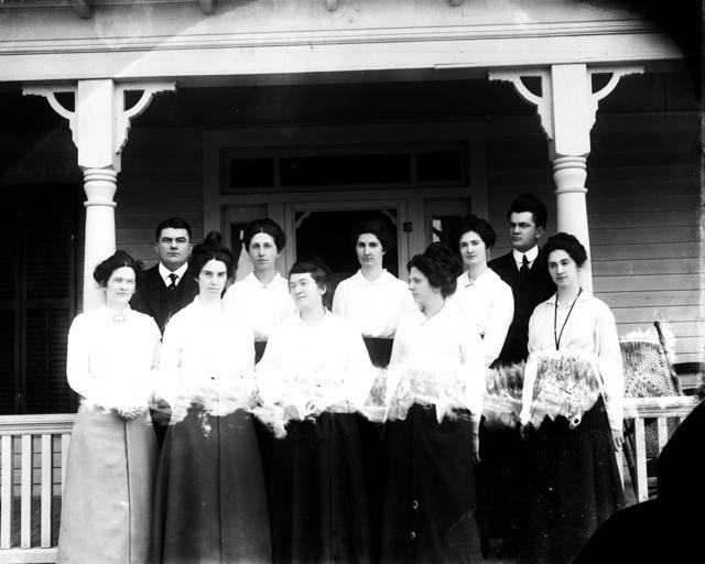 | Keywords: people groupshot blackandwhite monochrome black and white Eight unidentified women and two unidentified men posing for group picture on residential porch. No date; estimated 1920 (8"x10" glass plate negative). From the J. C. Knowles Photograph Collection, State Archives of North Carolina, Raleigh, NC. Eight unidentified women and two unidentified men posing for group picture on residential porch. No date; estimated 1920 (8"x10" glass plate negative). From the J. C. Knowles Photograph Collection, State Archives of North Carolina, Raleigh, NC. |