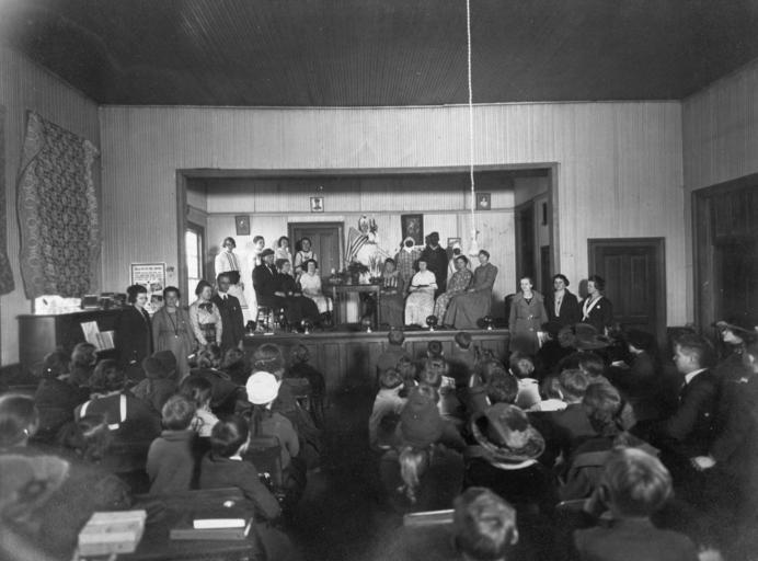 Keywords: blackandwhite monochrome indoor black and white Pikeville High School, Wayne County, NC; 1921. Pictured is an interior view of an audience of high school students and adults in a school room auditorium attending a stage performance. There is no ID label. Hand written on the back of the mounting card: “Special Opening Exercises, Pikeville Group Teachers Meeting, Spring of 1921. High School Students Present Play. Pikeville Teachers next to stage.” “The Clement Studio, Goldsboro, N.C.” is embossed on the mounting card. Albert O. Clement was a photographer active in Goldsboro 1904-1936; he operated his own studio in Goldsboro 1905-1936. Pikeville is a town in northern Wayne County, and also Township in north central Wayne County. From the Wayne County Schools Photo Collection, PhC.209, State Archives of North Carolina, Raleigh, NC. Pikeville High School, Wayne County, NC; 1921. Pictured is an interior view of an audience of high school students and adults in a school room auditorium attending a stage performance. There is no ID label. Hand written on the back of the mounting card: “Special Opening Exercises, Pikeville Group Teachers Meeting, Spring of 1921. High School Students Present Play. Pikeville Teachers next to stage.” “The Clement Studio, Goldsboro, N.C.” is embossed on the mounting card. Albert O. Clement was a photographer active in Goldsboro 1904-1936; he operated his own studio in Goldsboro 1905-1936. Pikeville is a town in northern Wayne County, and also Township in north central Wayne County. From the Wayne County Schools Photo Collection, PhC.209, State Archives of North Carolina, Raleigh, NC. |