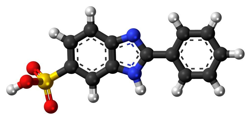 Keywords: Phenylbenzimidazole-sulfonic-acid-3D-balls.png Ball-and-stick model of the phenylbenzimidazole sulfonic acid molecule a common sunscreen agent Also known as ensulizole Colour code 505050 Carbon C black<br> F0F0F0 Hydrogen H white<br> F51E1E Oxygen O red<br> 3C50FA Nitrogen N blue<br> FAEB00 Sulfur S yellow<br> 2011-01-22 own DS Visualizer Jynto talk Space-filling version cc-zero Benzimidazoles Sulfonic acids Sunscreening agents Images by Jynto |