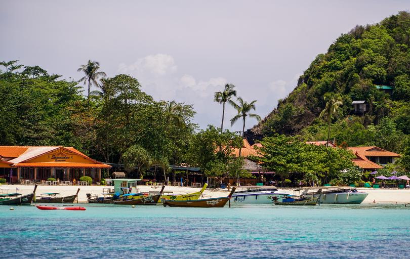Keywords: phi phi island tour phuket thailand beach architecture boats sea water tourism nature mountains rocks landscape travel summer holiday sky ocean outdoor tropical scenery clouds sunny