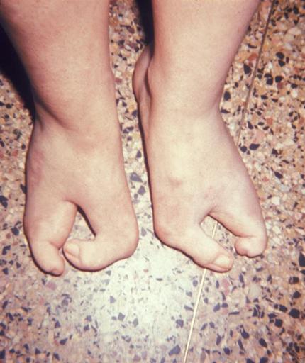 Keywords: PHIL 2631 lores.jpg A photograph of a child with cleft feet or lobster claw feet Cleft foot otherwise known as split lobster claw or partial adactyly is a rare inherited anomaly in which a single cleft extends proximally into the foot It usually occurs in conjunction with clawing of the hand http //phil cdc gov/phil_images/20021206/41/PHIL_2631_lores jpg 3-2-2008 CDC/Dr Allan Ebbin government work PD-USGov Ectrodactyly |