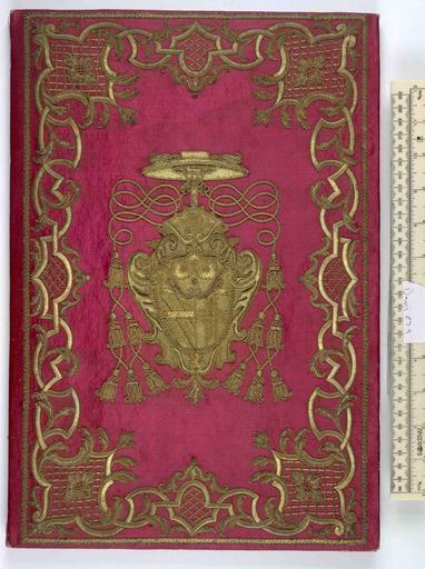 | Keywords: Philosophicae theses - Upper cover (Davis879).jpg Style Armorial; Caption Upper cover; Colour Pink; Edge Gilt exhibition history Decorative Technique Embroidered; Cover Material Silk Arms of Cardinal object history Text 1733; Rome; Guadagni Cardinal G A object type Cc-zero place of creation Binding Italy place of discovery M M Foot the Henry Davis Gift vol III British Library image http //www bl uk/catalogues/bookbindings/LargeImage aspx RecordId 020-000002188 ImageId ImageId 40699 Copyright BL Philosophicae theses Uploaded with GWToolset Philosophicae theses - Upper cover Davis879 http //www webarchive org uk/bldatasets/bindings/7201_4 jpg Bookbinding 18th-century bookbinding British Library Bookbindings |