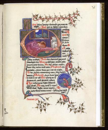 | Keywords: edinburgh phoebe anna traquair phoebeannatraquair elizabeth barrett browning elizabethbarrettbrowning sonnets from the portugese sonnetsfromtheportugese sonnet illumination manuscript art arts and crafts artsandcrafts nls photo border Key Arts and Crafts illuminated manuscript. Published on completion by William Hay in Edinburgh. From 1890 Traquair leased dedicated studio space in the Dean Studio, a disused church (a gap site since the 1950s) next to Drumsheugh Swimming Baths in Lynedoch Place, where her major manuscripts, including ‘Sonnets from the Portuguese’ were created, between 1892 and January 1897. More .... Key Arts and Crafts illuminated manuscript. Published on completion by William Hay in Edinburgh. From 1890 Traquair leased dedicated studio space in the Dean Studio, a disused church (a gap site since the 1950s) next to Drumsheugh Swimming Baths in Lynedoch Place, where her major manuscripts, including ‘Sonnets from the Portuguese’ were created, between 1892 and January 1897. More .... |