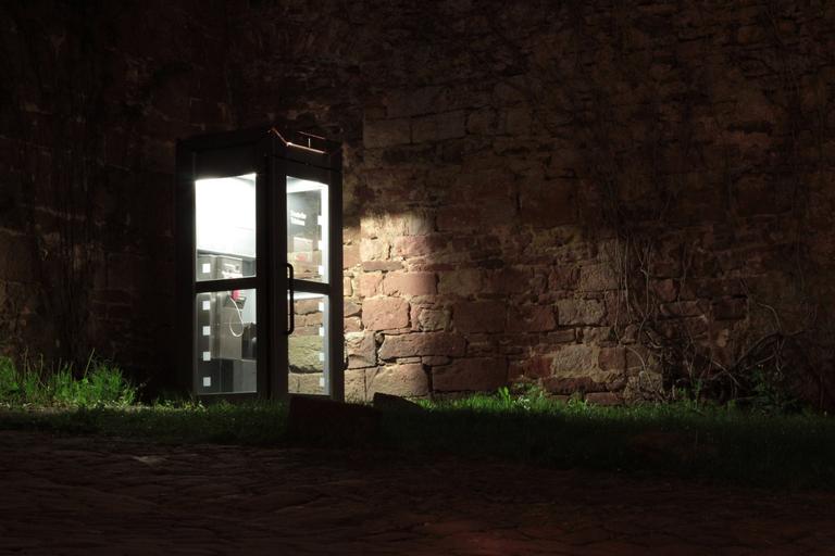 Keywords: phone booth night photograph light wall building lonely emotions illuminated lights night evening phone