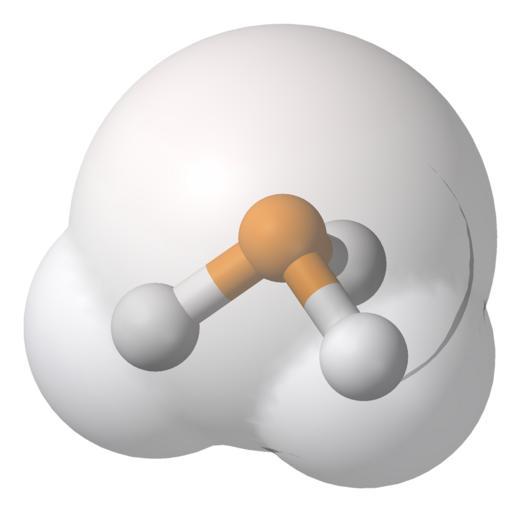 | Keywords: Phosphine-elpot-transparent-3D-balls.png A van der Waals' surface coloured according to charge superimposed on a ball-and-stick model of the phosphine molecule PH<sub>3</sub> Red represents partially negatively charged regions blue represents partially positively charged regions and white represents neutral uncharged regions Created in Accelrys DS Visualizer 1 5 edited with Photoshop Elements 3 0 Own 2007-11-30 Ben Mills Benjah-bmm27 Images by Ben Mills Molecular electrical potential surfaces Phosphine |