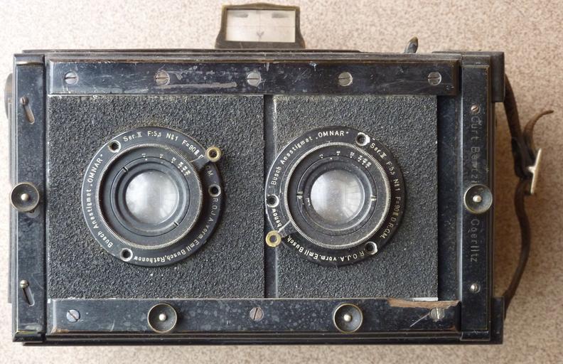 Keywords: Photo camera (front view) Curt Bentzin Görlitz.JPG pl Aparat fotograficzny stereoskopowy na płyty szklane firmy Curt Bentzin Görlitz own Julo 2010-07-20 Julo Stereo cameras Curt Bentzin