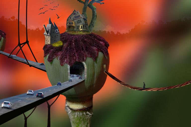 Keywords: photo montage composing traffic road autos poppy plant flower nature macro vehicles away highway photo sky retro automotive pkw bridge suspension bridge passengers cars classic limousine spotlight