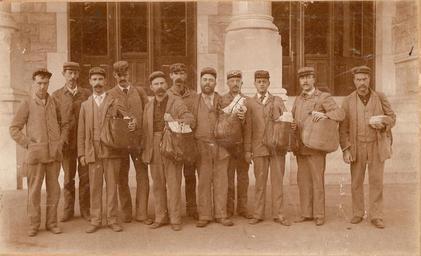 | Keywords: smithsonian institution smithsonianinstitution men mustache moustache standing uniform group eleven outdoors concord new hampshire newhampshire mail carriers workers postal work working satchels post office postoffice 1889 letter carriers lettercarriers post national postal museum nationalpostalmuseum retro1 monochrome Date: c. 1890  Object number: A.2009-39  Medium: paper; photo-emulsion  Description: Group of eleven unidentified letter carriers stand in front of the Concord, New Hampshire, post office. The post office, designed by James Riss Hill, was built in 1889. The carriers are posed with leather satchels full of mail and wearing uniforms, including caps with service badges, most in the wreath-style, that bear their individual identification numbers. National Postal Museum, Curatorial Photographic Collection Photographer: Unknown  Place: United States of America      New Hampshire  See more items in: National Postal Museum Collection  Credit line: National Postal Museum, Curatorial Photographic Collection   Photographer: Unknown  Persistent URL:http://www.arago.si.edu/index.asp?con=2&cmd=1&id=207603  Repository:National Postal Museum  View more collections from the Smithsonian Institution. Date: c. 1890  Object number: A.2009-39  Medium: paper; photo-emulsion  Description: Group of eleven unidentified letter carriers stand in front of the Concord, New Hampshire, post office. The post office, designed by James Riss Hill, was built in 1889. The carriers are posed with leather satchels full of mail and wearing uniforms, including caps with service badges, most in the wreath-style, that bear their individual identification numbers. National Postal Museum, Curatorial Photographic Collection Photographer: Unknown  Place: United States of America      New Hampshire  See more items in: National Postal Museum Collection  Credit line: National Postal Museum, Curatorial Photographic Collection   Photographer: Unknown  Persistent URL:http://www.arago.si.edu/index.asp?con=2&cmd=1&id=207603  Repository:National Postal Museum  View more collections from the Smithsonian Institution.  |