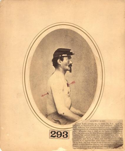 | Keywords: Photograph of Ludwig Kohn..JPG  en Man in profile seated shirtless and wearing a military cap;red ink showing the path of the bullet 2013-09-27 09 07 41 Courtesy of the National Library of Medicine Images from the History of Medicine IHM http //ihm nlm nih gov/images/B030324 Also showcased in the book Hidden Treasure New York NY Blast Books 2012 p 183 HMD Prints Photos call number PP059703 no 293 alb Bontecou Reed B Reed Brockway 1824-1907 photographer Custom license marker 2013 09 27 PD-USGov Uploaded with UploadWizard Wounds Gunshot wounds Military people in the 19th century American Civil War medicine Medical photography |