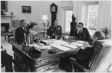 | Keywords: Photograph of President Gerald Ford Meeting with Brent Scowcroft, Graham Martin, General Frederick Weyand, and Henry... - NARA - 186794.tif This photograph was taken in the Oval Office of the White House Pictured with President Ford are Brent Scowcroft Deputy Assistant to the President for National Security Affairs; Graham Martin United States Ambassador to the Republic of Vietnam; Army Chief of Staff General Frederick Weyand; and Secretary of State Henry A Kissinger Gerald Ford has his back to the camera Brent Scowcroft is partially obscured General notes 186794 Local identifier GRF-WHPO-3779 7 President 1974-1977 Ford White House Photographic Office 1974 - 1977 Kennerly David Hume 1947- Photographer 1312484 <br /> Institution Gerald R Ford Presidential Library Gerald R Ford Library NLGRF 1000 Beal Avenue Ann Arbor MI 48109-2114 1975-03-25 Record group Collection GRF-WHPO White House Photographic Office Collection Ford Administration 12/06/1973 - 01/20/1977 Record group ARC 1136 Gerald R Ford White House Photographs compiled 08/09/1974 - 01/20/1977 Series ARC 1756311 File unit File unit ARC Variant control numbers NAIL Control Number NLF-WHPO-A-A3779 7 yes Other versions Gerald R Ford Presidential Library and Museum-cooperation PD-USGov Gerald Ford in the Oval Office Wilson desk Meetings Graham Martin Frederick C Weyand Henry Kissinger Gerald Ford in 1975 Gerald R Ford Presidential Library and Museum series Gerald R Ford White House Photographs compiled 08/09/1974 - 01/20/1977 Art in the Oval Office |
