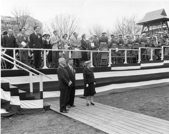 Keywords: nara:arcid=6233771 u.s. national archives usnationalarchives harry s. truman library harrystrumanlibrary military band militaryband harry s. truman harrystruman bess truman besstruman standing at attention standingatattention 1952 1950's 1950s ceremony monochrome blackandwhite outdoor black and white Original Caption: Photograph of President Harry S. Truman at Carillon Ceremony, 04/04/1952 Created By: National Archives and Records Administration. Office of Presidential Libraries. Harry S. Truman Library. (04/01/1985 - ) From: Series: Photographs Relating to the Administration, Family, and Personal Life of Harry S. Truman, compiled 1957 - 2004, documenting the period 1849 - 2004 Contact: Harry S. Truman Library (NLHST), 500 West U.S. Highway 24, Independence, MO, 64050-1798. PHONE: 816-268-8272; FAX: 816-268-8295; EMAIL:truman.reference@nara.gov. Production Dates: 04/04/1952 Scope and Content Note: President Harry S. Truman (left) with First Lady Bess W. Truman (right) at Meridian Hill Park, Washington, D.C. They are there for a ceremony in which Queen Juliana of the Netherlands presented a carillon to the people of the United States. Standing between them is Edward J. Kelly, Superintendent of National Capital Parks. All others unidentified. Persistent URL: arcweb.archives.gov/arc/action/ExternalIdSearch?id=6233771 Truman Library URL: www.trumanlibrary.org/photographs/view.php?id=40067&rr= Access Restrictions: Unrestricted Use Restrictions: Unrestricted Original Caption: Photograph of President Harry S. Truman at Carillon Ceremony, 04/04/1952 Created By: National Archives and Records Administration. Office of Presidential Libraries. Harry S. Truman Library. (04/01/1985 - ) From: Series: Photographs Relating to the Administration, Family, and Personal Life of Harry S. Truman, compiled 1957 - 2004, documenting the period 1849 - 2004 Contact: Harry S. Truman Library (NLHST), 500 West U.S. Highway 24, Independence, MO, 64050-1798. PHONE: 816-268-8272; FAX: 816-268-8295; EMAIL:truman.reference@nara.gov. Production Dates: 04/04/1952 Scope and Content Note: President Harry S. Truman (left) with First Lady Bess W. Truman (right) at Meridian Hill Park, Washington, D.C. They are there for a ceremony in which Queen Juliana of the Netherlands presented a carillon to the people of the United States. Standing between them is Edward J. Kelly, Superintendent of National Capital Parks. All others unidentified. Persistent URL: arcweb.archives.gov/arc/action/ExternalIdSearch?id=6233771 Truman Library URL: www.trumanlibrary.org/photographs/view.php?id=40067&rr= Access Restrictions: Unrestricted Use Restrictions: Unrestricted