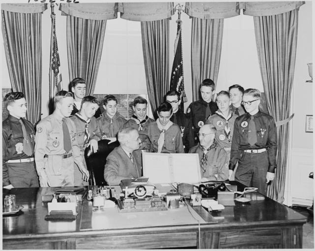 | Keywords: Photograph of President Truman in the Oval Office, receiving a report on the accomplishments of the Boy Scouts from a... - NARA - 200268.jpg Scope and content General notes 200268 Local identifier National Archives and Records Administration Office of Presidential Libraries Harry S Truman Library 04/01/1985 - NARA-Author Rowe Abbie 1905-1967 Photographer 8451352 <br /> Harry S Truman Library NLHST 500 West U S Highway 24 Independence MO 64050-1798 1951-02-06 Record group Collection HST-AVC Audiovisual Collection 1957 - 2006 Record group ARC 1207 Photographs Relating to the Administration Family and Personal Life of Harry S Truman compiled 1957 - 2004 documenting the period 1849 - 2004 Series ARC 198606 File unit File unit ARC Variant control numbers NAIL Control Number NLT-AVC-PHT- 73 3501 Other versions <gallery> File Photograph_of_President_Truman_in_the_Oval_Office _receiving_a_report_on_the_accomplishments_of_the_Boy_Scouts_from_a _-_NARA_-_200268 tif tif File Photograph_of_President_Truman_in_the_Oval_Office _receiving_a_report_on_the_accomplishments_of_the_Boy_Scouts_from_a _-_NARA_-_200268 jpg jpg </gallery> NARA-cooperation PD-USGov DEFAULTSORT 19510206 February 1951 in the United States Harry S Truman in 1951 White House in 1951 Boy Scouts of America Children in the Oval Office People with Curtains Harry S Truman in the Oval Office Photographs by Abbie Rowe Scouting in Washington D C Black and white photographs of people Photographs taken on 1951-02-06 |