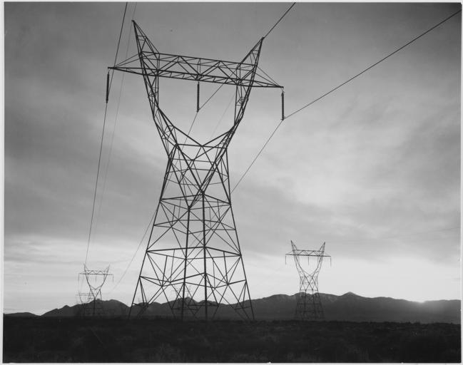 | Keywords: Photograph of Transmission Lines in Mojave Desert Leading from Boulder Dam, 1941 - NARA - 519839.jpg Mojave Desert Leading from Boulder Dam 1941 519839 Local identifier 79-AAB-03 Department of the Interior National Park Service Branch of Still and Motion Pictures - NARA-Author Adams Ansel 1902-1984 Photographer 1332556 <br /> Still Picture Records Section Special Media Archives Services Division NWCS-S National Archives at College Park 8601 Adelphi Road College Park MD 20740-6001 1941 Record group Record Group 79 Records of the National Park Service 1785 - 2006 Record group ARC 408 Ansel Adams Photographs of National Parks and Monuments compiled 1941 - 1942 documenting the period ca 1933 - 1942 Series ARC 519830 Variant control numbers NAIL Control Number NWDNS-79-AA-B03 General notes NARA image of San Bernardino County California Scope and content Original caption Transmission lines in Mojave Desert 1941 File unit File unit ARC <gallery> File Photograph_of_Transmission_Lines_in_Mojave_Desert_Leading_from_Boulder_Dam _1941_-_NARA_-_519839 tif tif File Photograph_of_Transmission_Lines_in_Mojave_Desert_Leading_from_Boulder_Dam _1941_-_NARA_-_519839 jpg jpg </gallery> NARA-cooperation PD-USGov Hoover Dam as photographed by Ansel Adams Power lines in California Pylons in the United States Mojave_Desert 1941 in California NARA images of San Bernardino County California Black and white photographs of structures Black and white photographs of California |