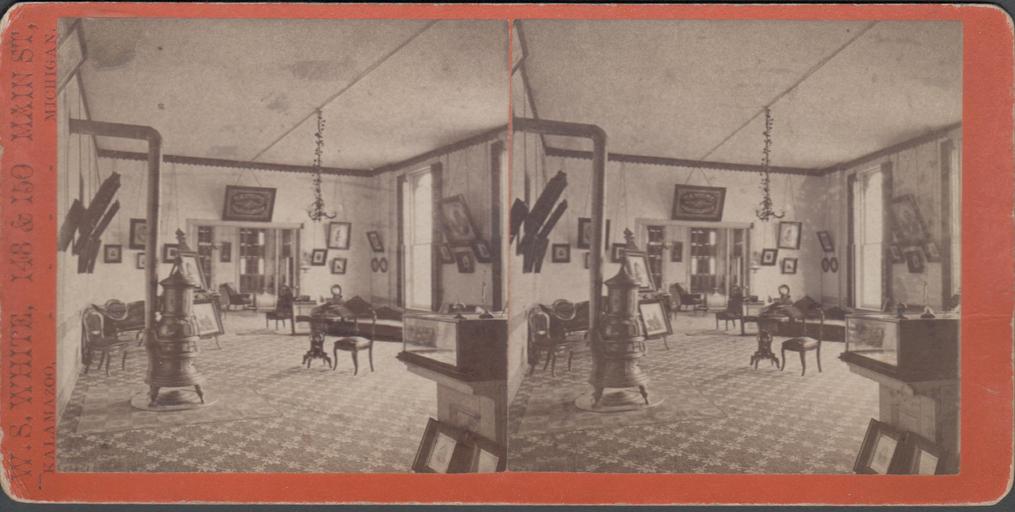 | Keywords: kalamazoo history public library photography studio interior stove michigan Interior view; several framed photos hang on the walls and are otherwise displayed throughout the room. Several side chairs and settees are also visible. A wood-burning stove is at the left. A sign over the door reads: "W. S. White Photographer".  KPL catalogue number P-880 Interior view; several framed photos hang on the walls and are otherwise displayed throughout the room. Several side chairs and settees are also visible. A wood-burning stove is at the left. A sign over the door reads: "W. S. White Photographer".  KPL catalogue number P-880 |